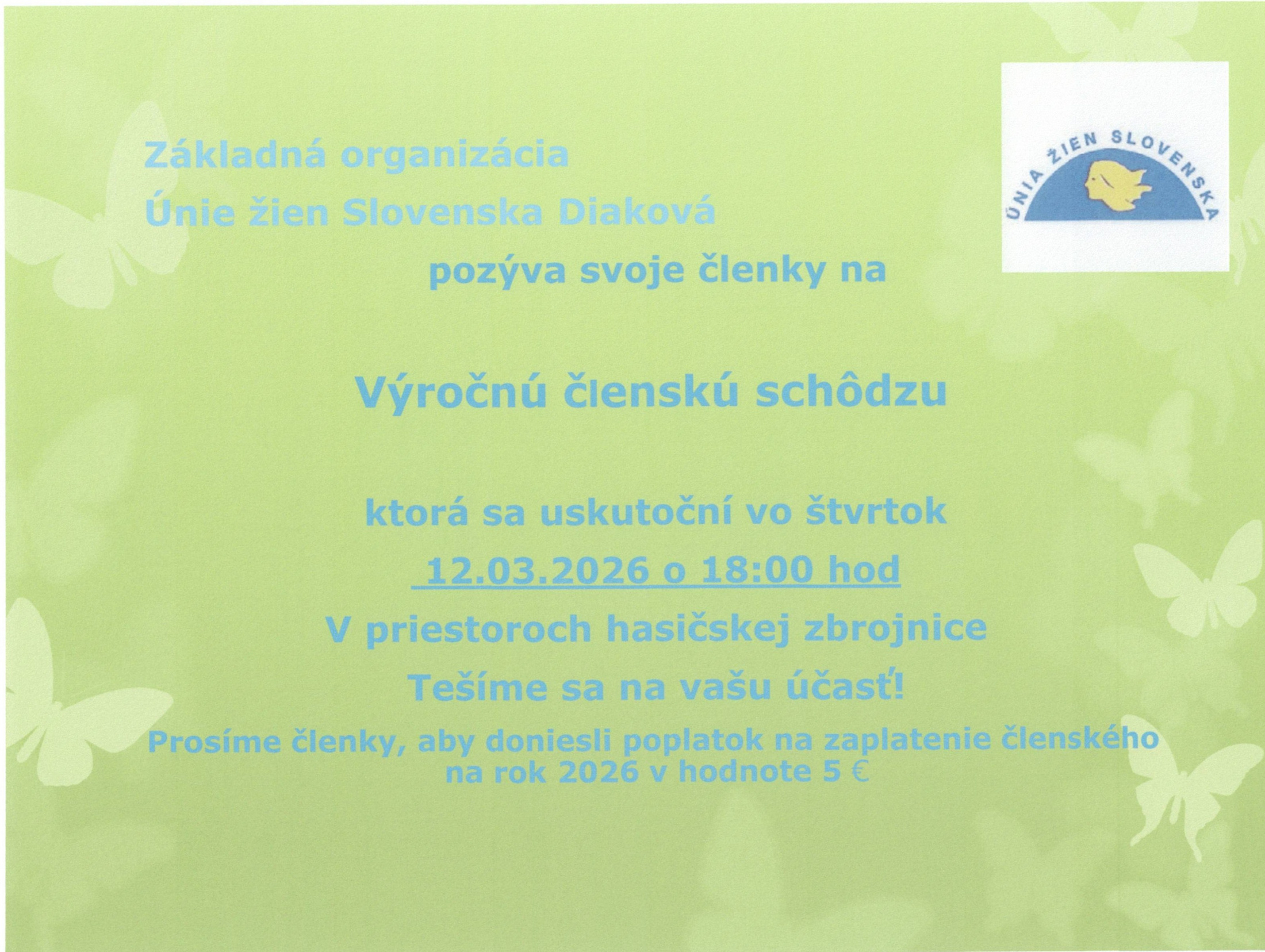 Výbor Základnej organizácie Únie žien Slovenska v Diakovej pozýva svojich členov na výročnú členskú schôdzu, ktorá sa uskutoční vo štvrtok 12. marca 2026 o 18h v sále Požiarnej zbrojnice v Diakovej. Na schôdzi sa zároveň bude vyberať členské 5 €.